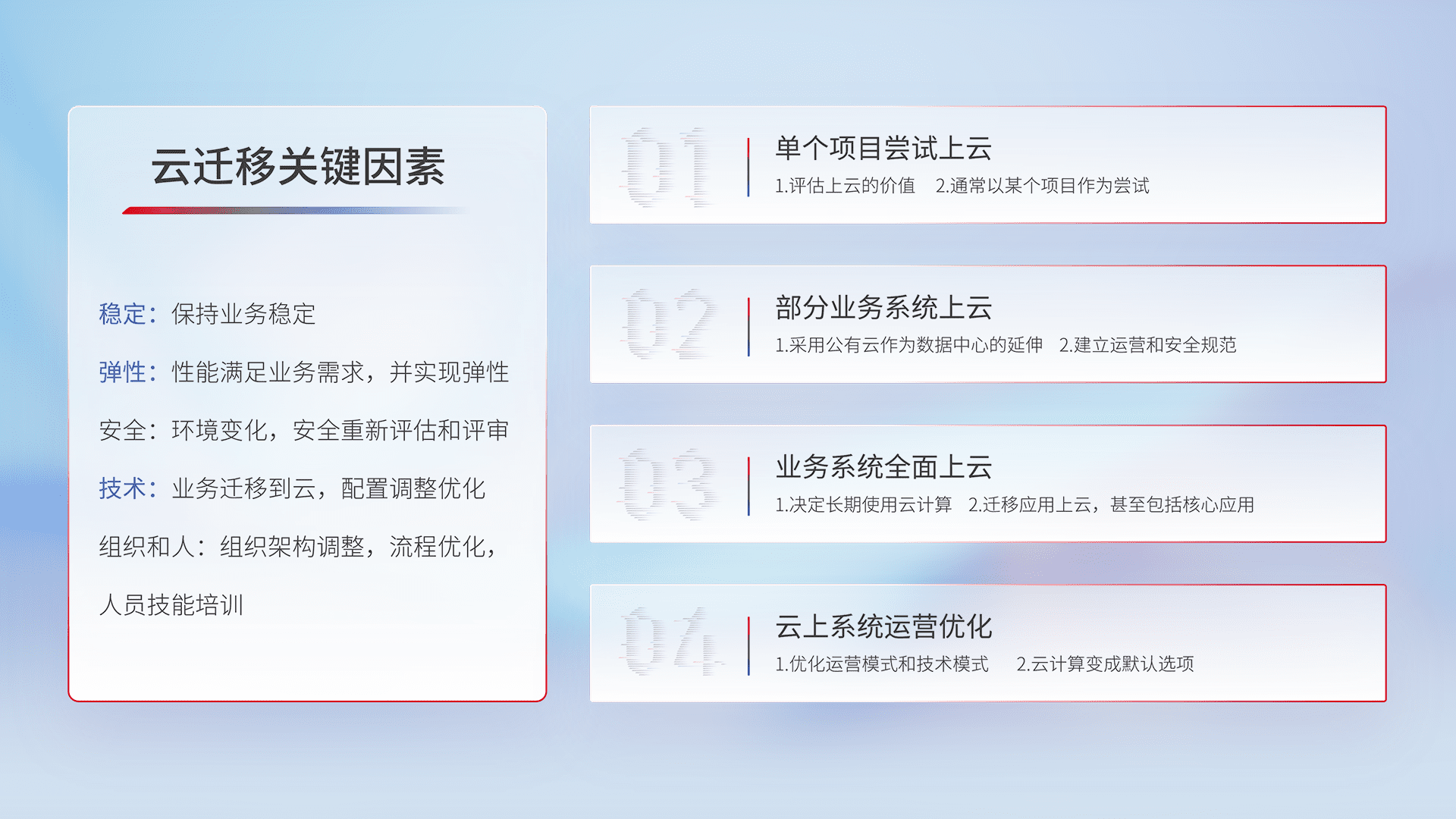 结合实际业务,,从规划设计、、、云平台选型、、、云原生改造、、、数据迁移、、、、集成交付,,,,迁移全过程为客户识别最佳上云路径,,,做好风险识别管理,,,设计网络架构、、、、身份权限、、安全审计合规、、、操作审计、、日志审计、、、、监控告警策略、、、多站点容灾设计等,,,,对云上基础设施进行整体规划,,提升IT治理水平,,,,以满足弹性、、高可用、、高性能的需求。。