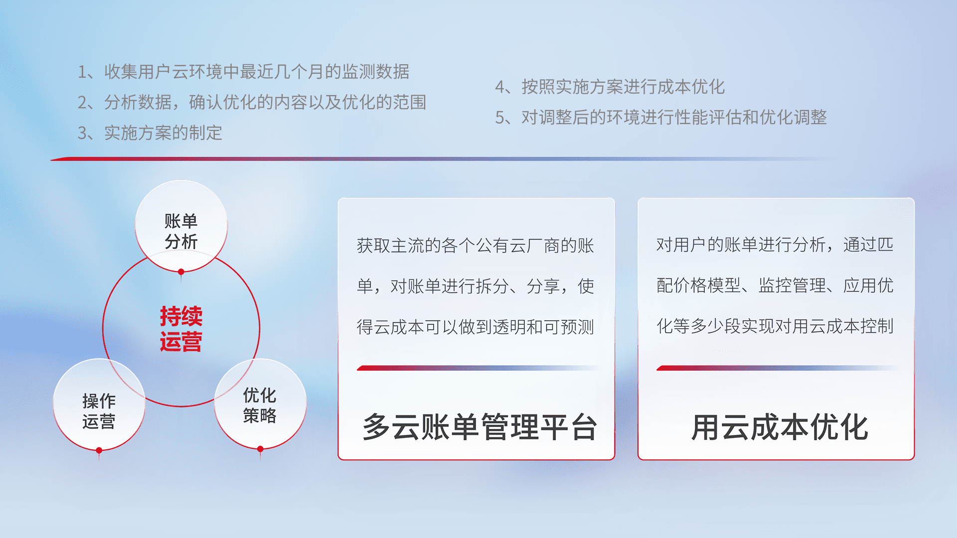 通过多云纳管,,,,以统一的资源数据模型把客户的云资源进行抽象和封装,,进而实现对多云资源的统一操作,,,保障云资源管理的可靠性、、稳定性与可用性。。。。量身定制化运维内容,,配置、、、开发运维、、、、补丁管理、、、备份、、监控、、认证和访问管理、、、、审计和日常巡检等,,,保障在用云过程中的可靠度,,,,稳定度以及高可用率。。。